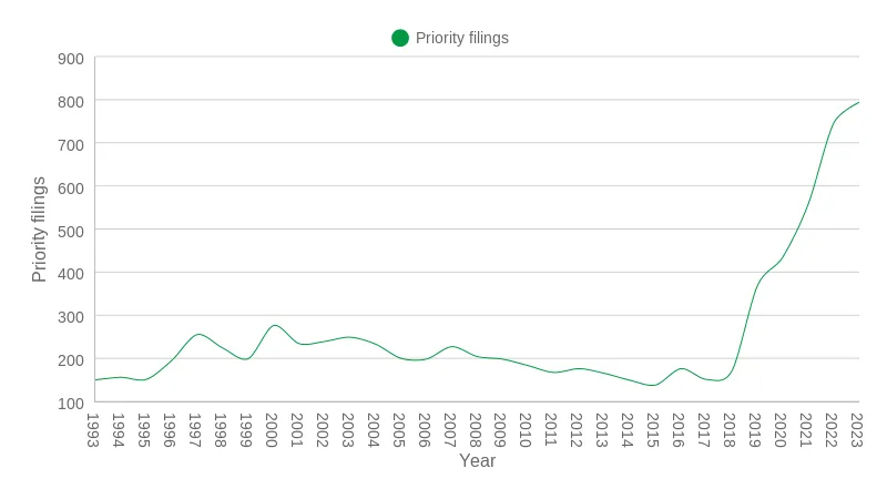Географически в 2023 году впервые по Южная Корея занимает первое место в мире с 215 патентными заявками , рост более чем на 20% по сравнению с 2022 годом. На уровне предприятий Немецкий химический гигант BASF SE обогнал Eastman Chemical Company как крупнейшего заявителя на патент в этой области. , с 36 заявками в 2023 г. (11 в 2022 г.). В отчете также отмечается, что число организаций, впервые подающих заявки на патенты в этой области, за последние пять лет увеличилось более чем в три раза, что свидетельствует о том, что активность новых участников и научно-исследовательских учреждений растет.